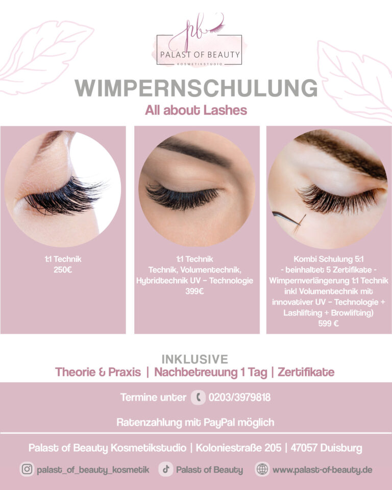 Die Schulung 5:1 beinhaltet die Wimpernverlängerung 1:1 Technik, die Volumentechnik, innovativer UV – Technologie und die Hybridtechnik + Lashlifting + Browlifting) beträgt 599€* und beinhaltet Inkl. 5 Zertifikate.